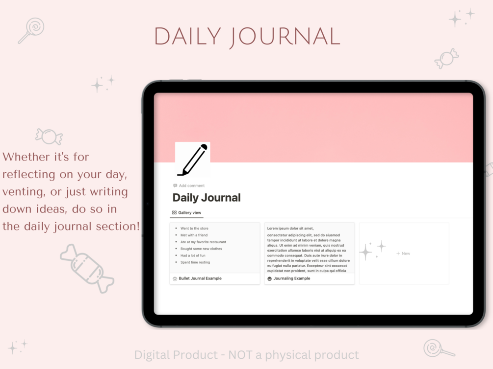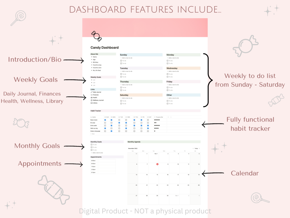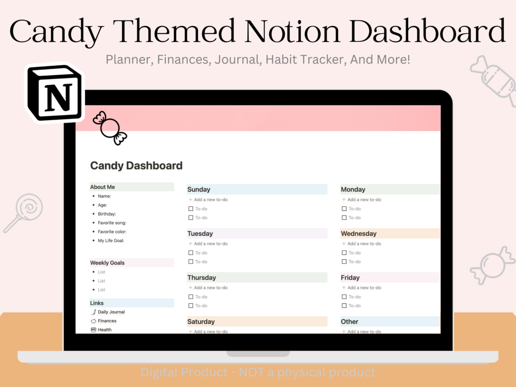 Pastel Candy Themed Sweet Minimalist Notion Dashboard | Notion Planner, Health Tacker, Habit Tracker, Financial, Reading / Library, Journal