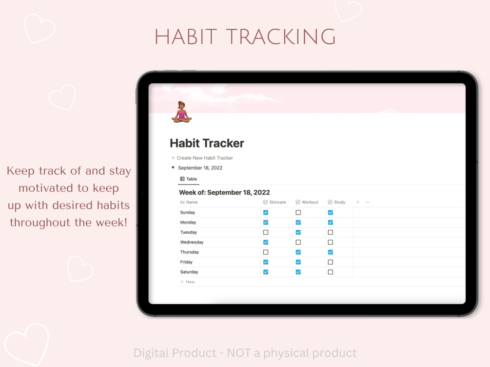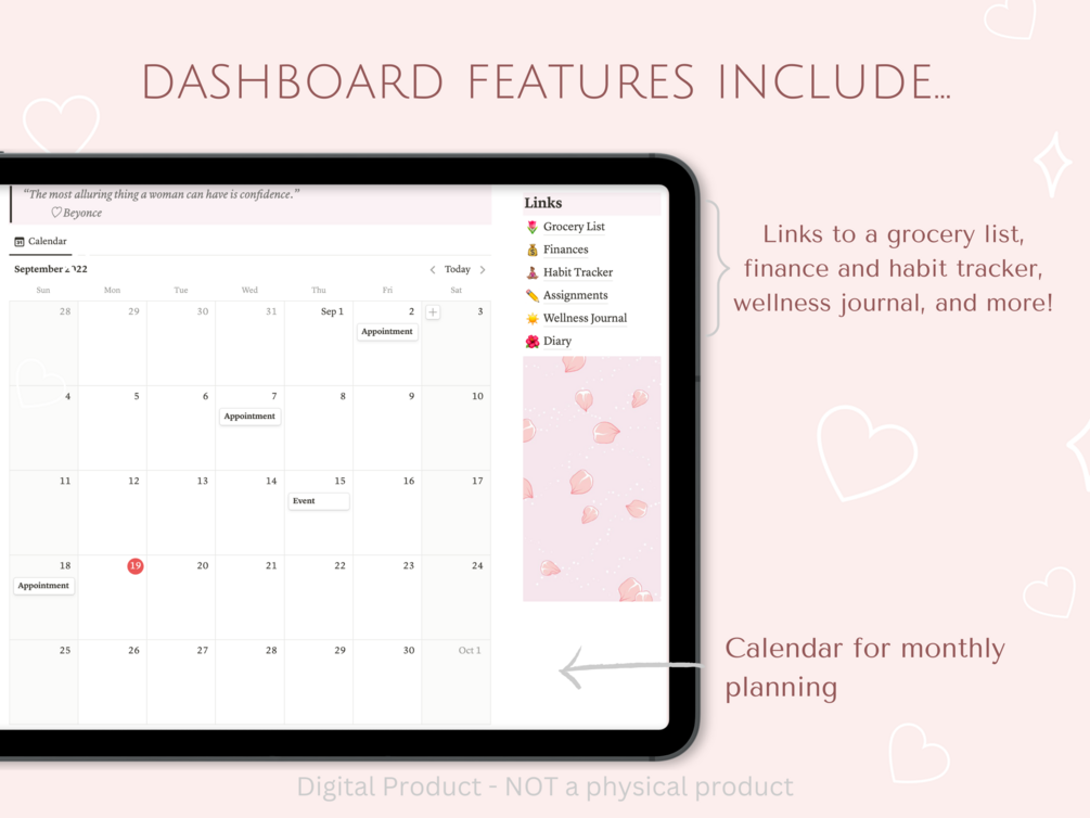 Keep your life organized while adding a beautiful touch of cute feminine energy to your day! This template is perfect for planning all aspects of your life and staying inspired to make your life the best it can be.